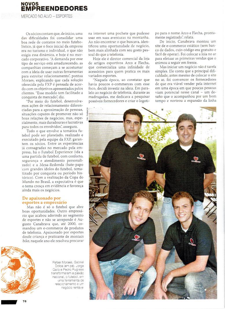 A Revista Meu Próprio Negócio fez uma matéria sobre o potêncial do mercado de esportes. A Arco e flecha foi a representante do mercado de Esportes Outdoor, contando sua história de sucesso e oferecendo dicas para novos Empreendedores. Para ler a matéria, clique sobre a imagem desejada com o botão direito do mouse e selecione "exibir imagem".